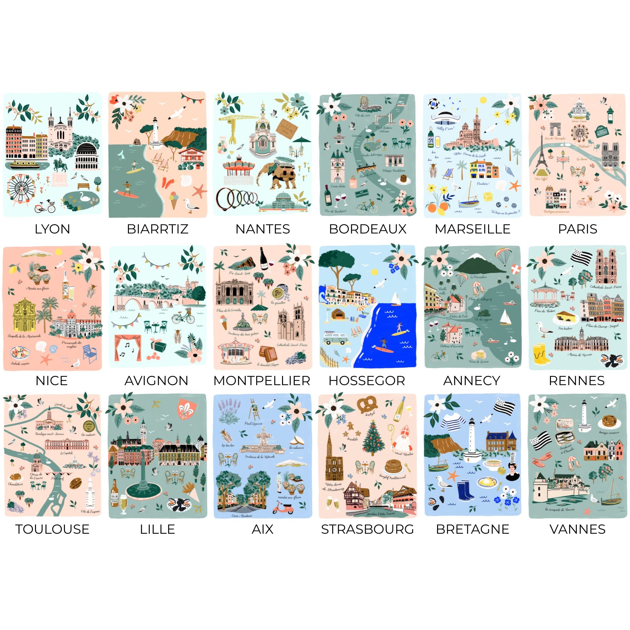 Paris, Marseille, Lyon, Biarritz, Nantes, Bordeaux, Nice, Avignon, Montpellier, Hossegor, Annecy, Rennes, Toulouse, Lille, Aix-en-Provence, Strasbourg, Bretagne, Vannes.