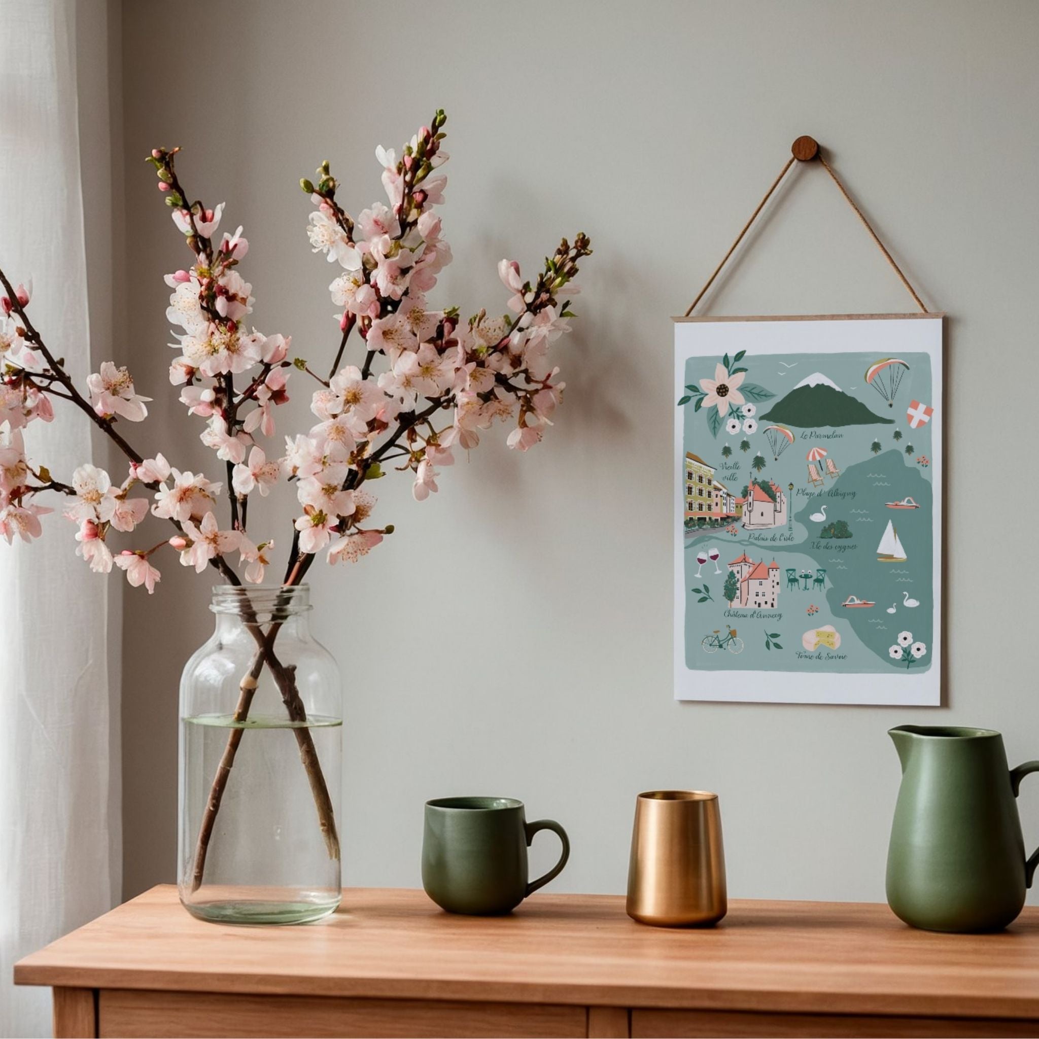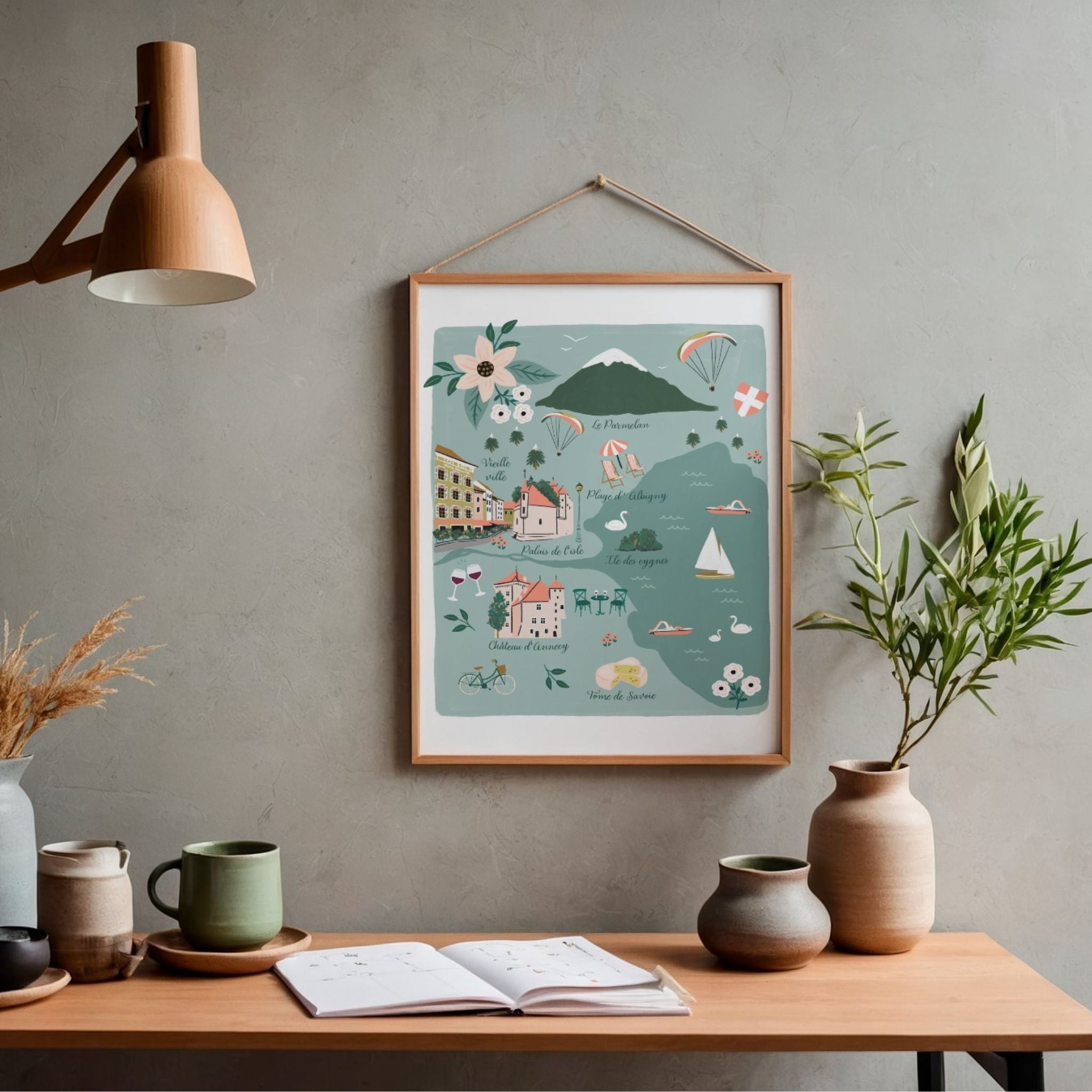Découvrez une belle affiche d’Annecy, dessinée à la main, qui met en valeur le charme et la douceur de la ville.