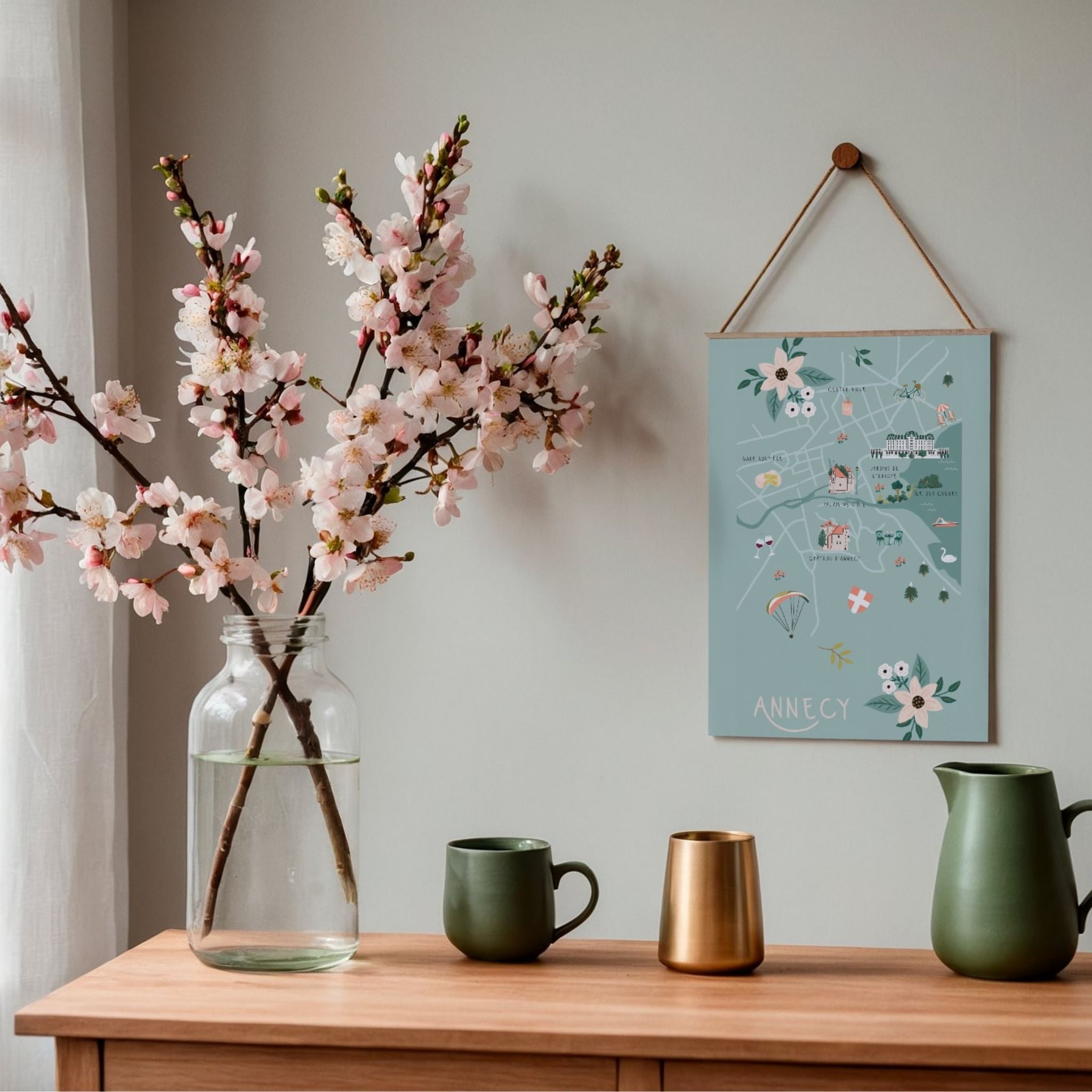 Découvrez une belle affiche d’Annecy, dessinée à la main, qui met en valeur le charme et la douceur de la ville.