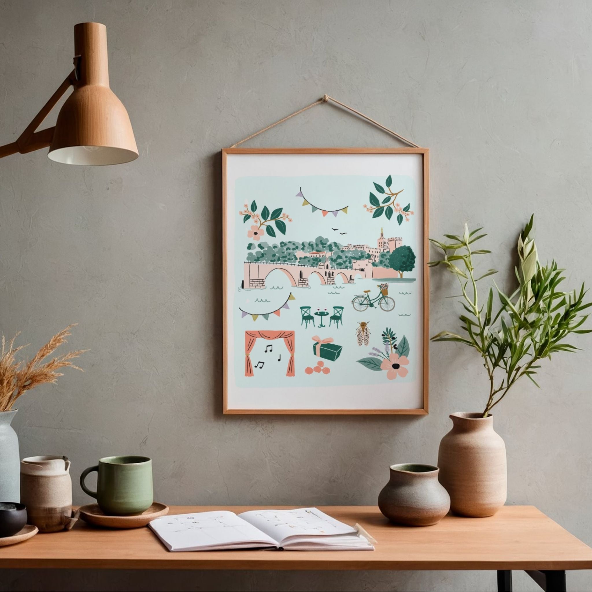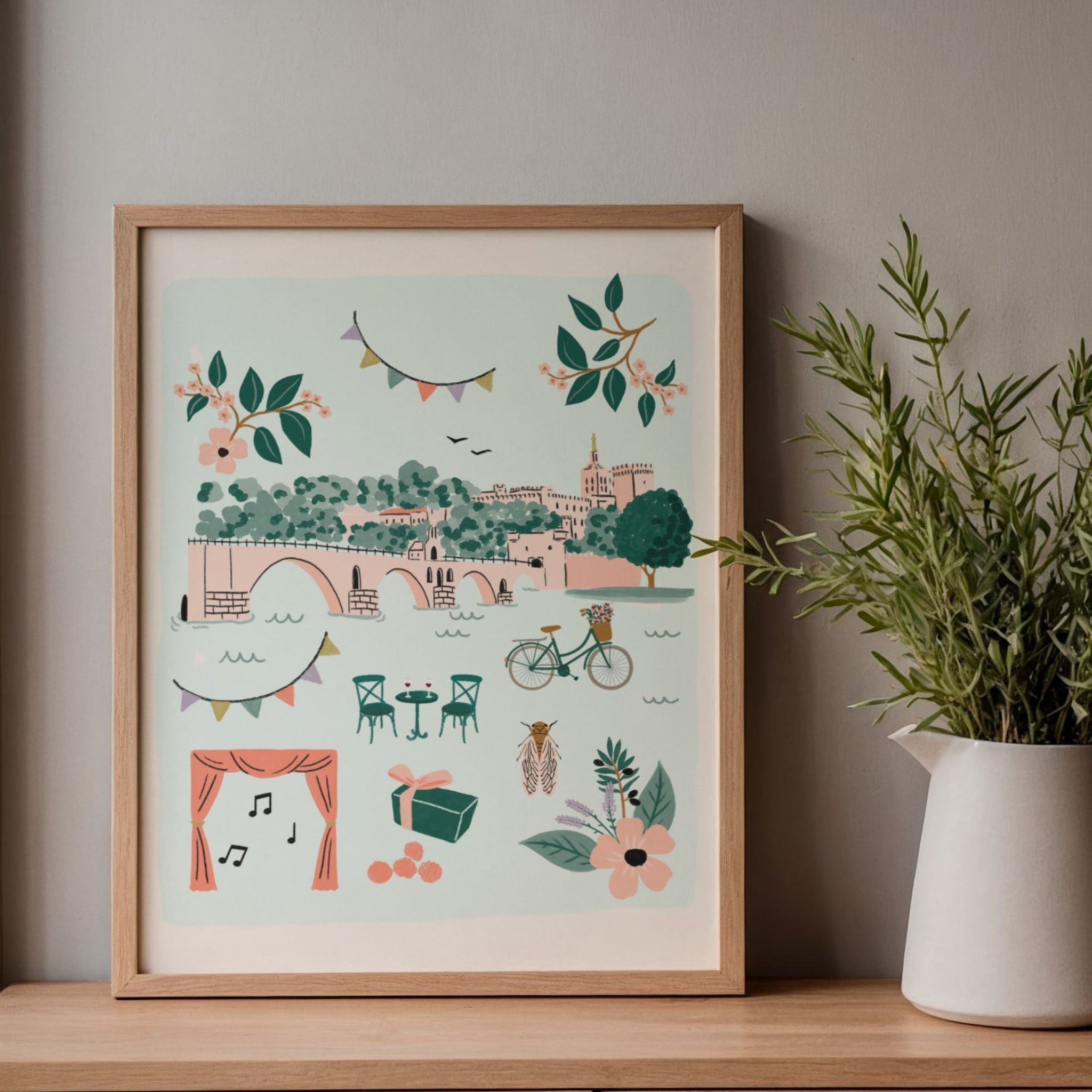 Découvrez une belle affiche d'Avignon dessinée à la main, qui met en valeur le charme et la douceur de la ville.