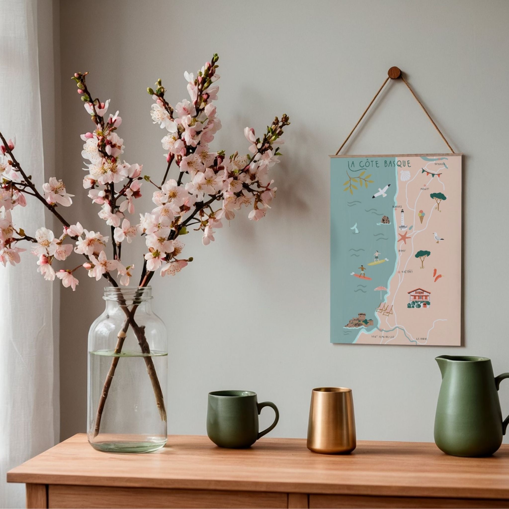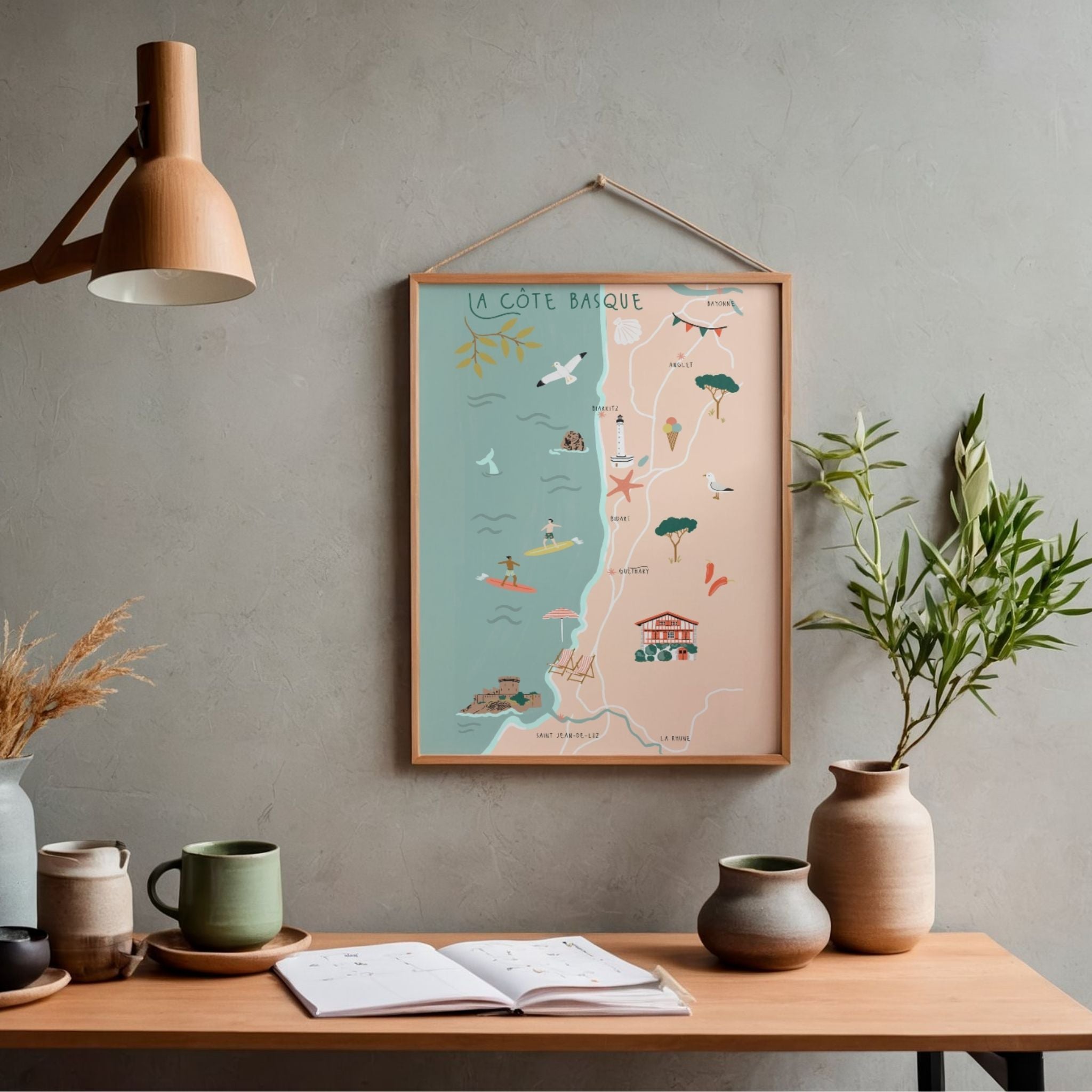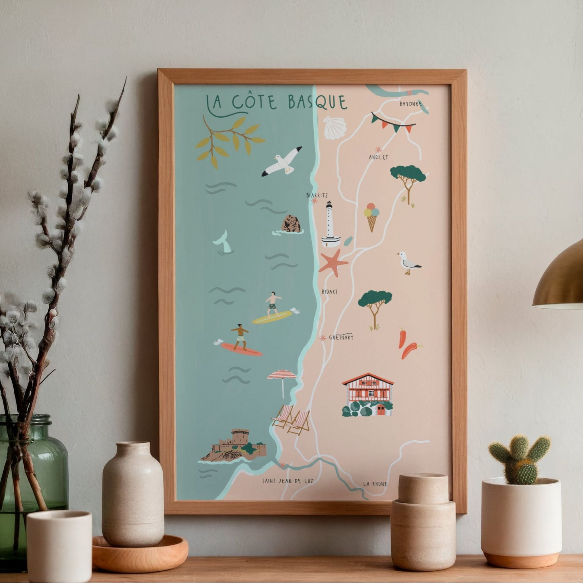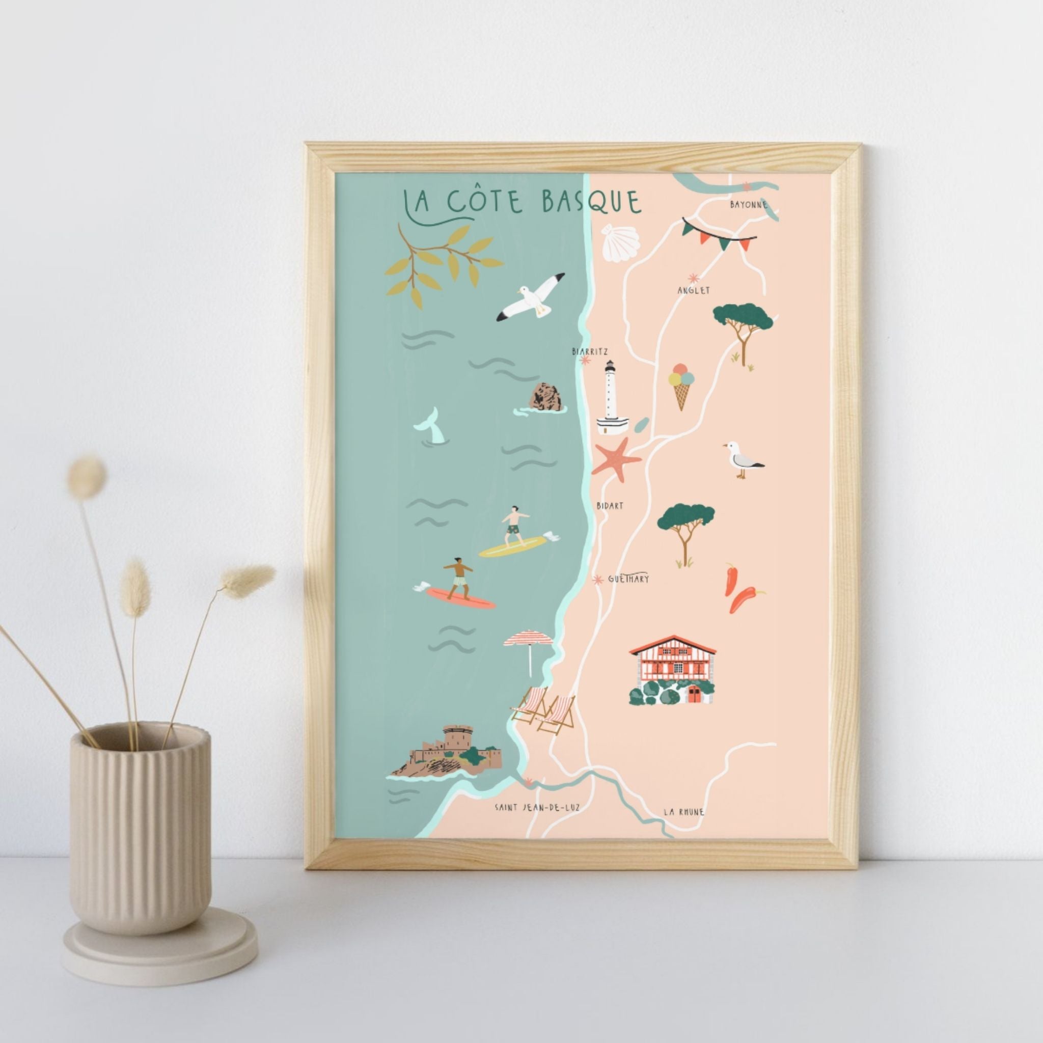Découvrez une belle affiche de Biarritz & la Cote Basque, dessinée à la main, qui met en valeur le charme et la douceur de la région.