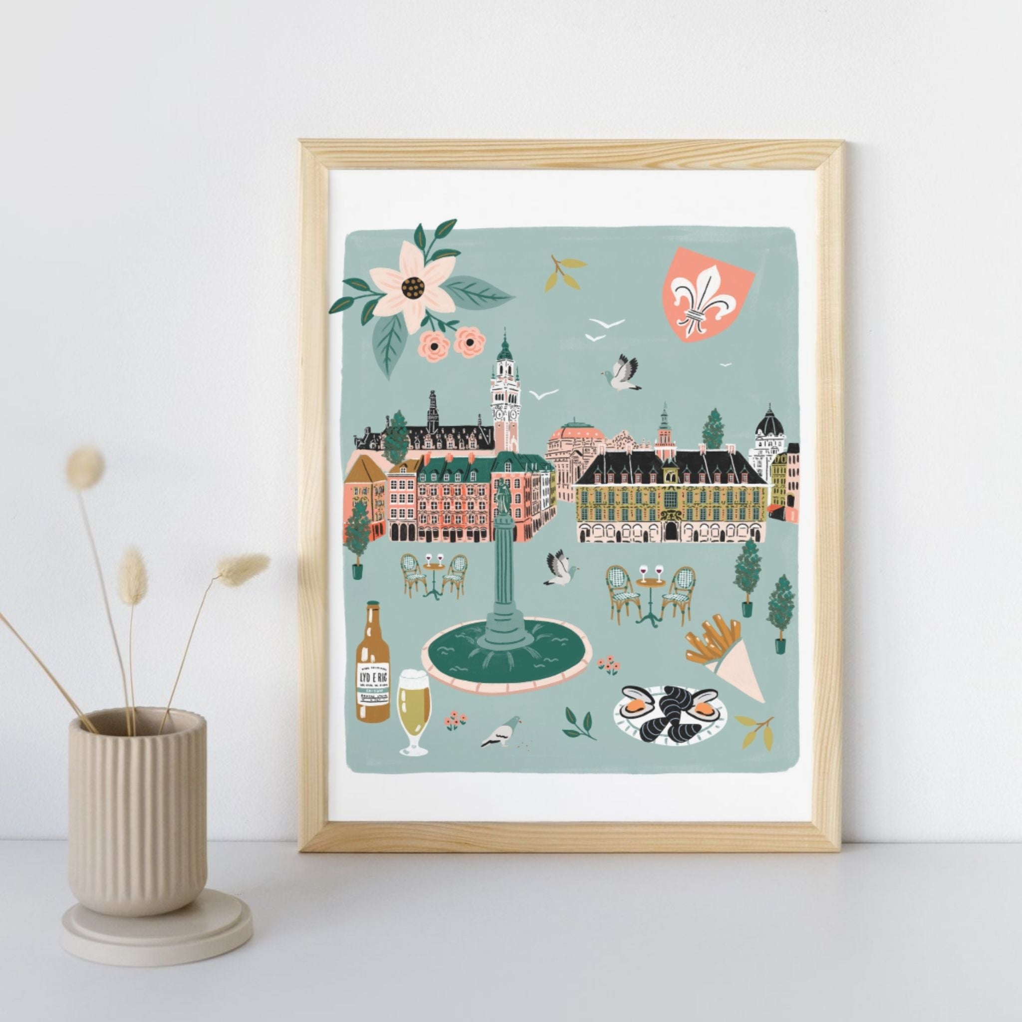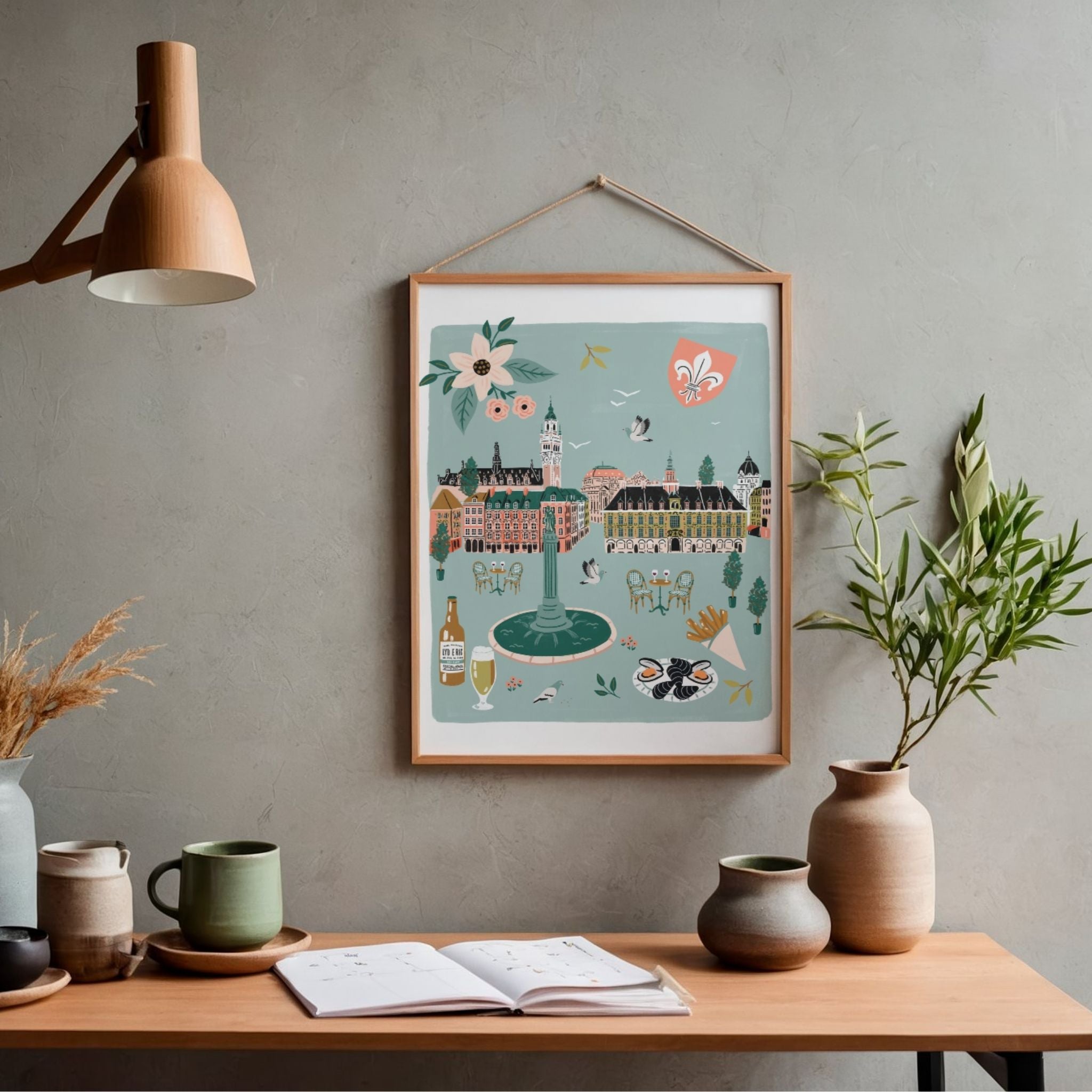 Découvrez une belle affiche de Lille dessinée à la main, qui met en valeur le charme et la douceur de la ville.