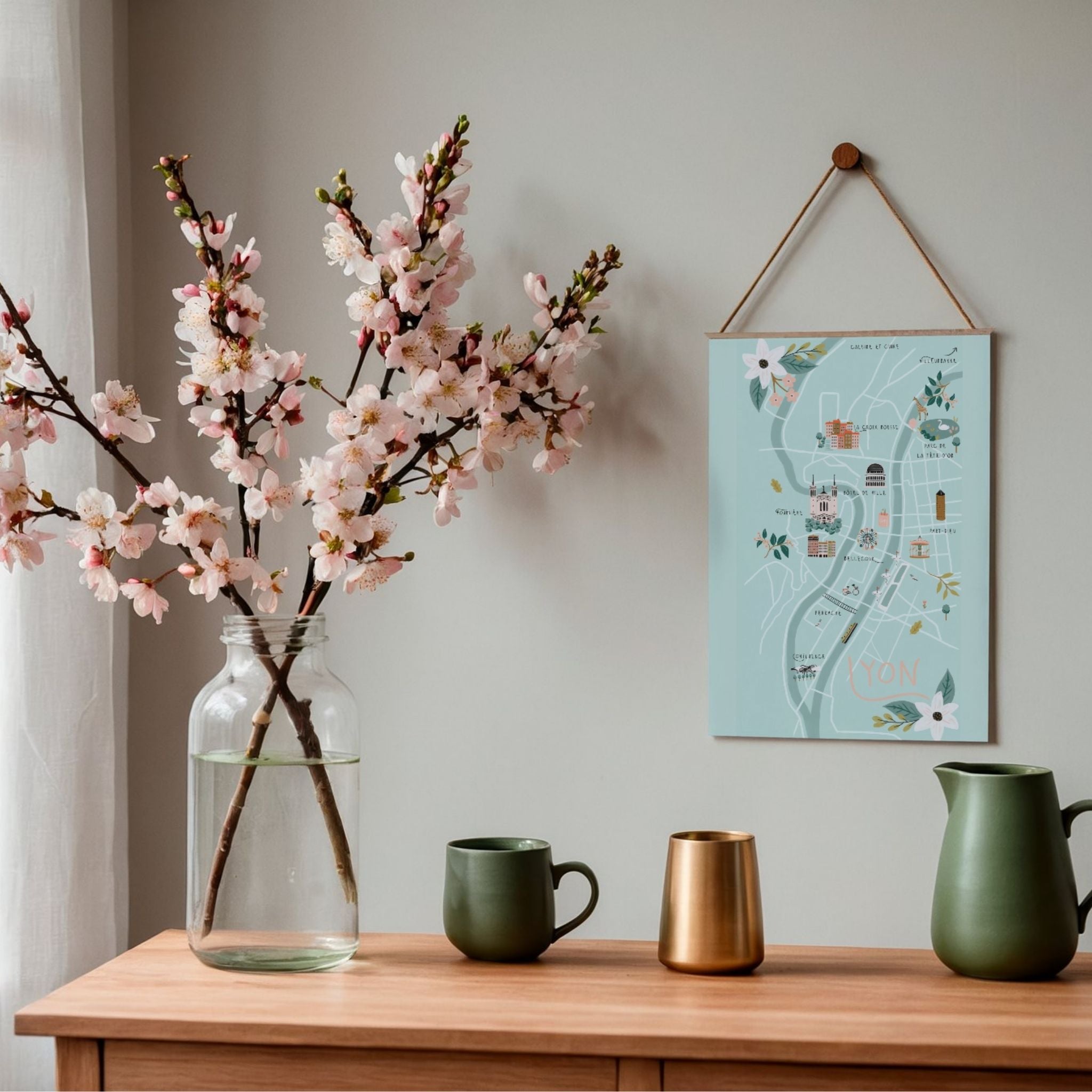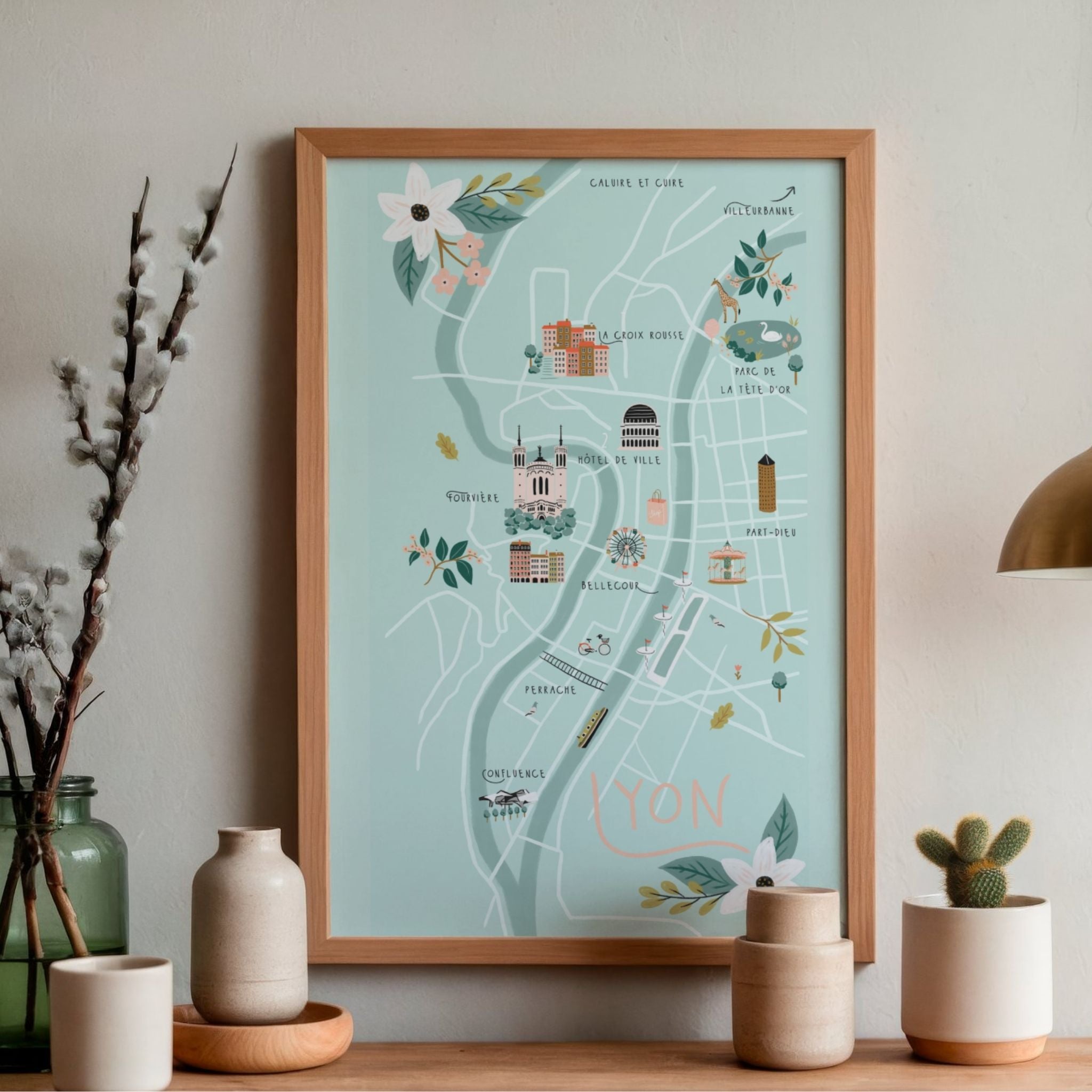 Découvrez une belle affiche de Lyon, dessinée à la main, qui met en valeur le charme et la douceur de la ville.