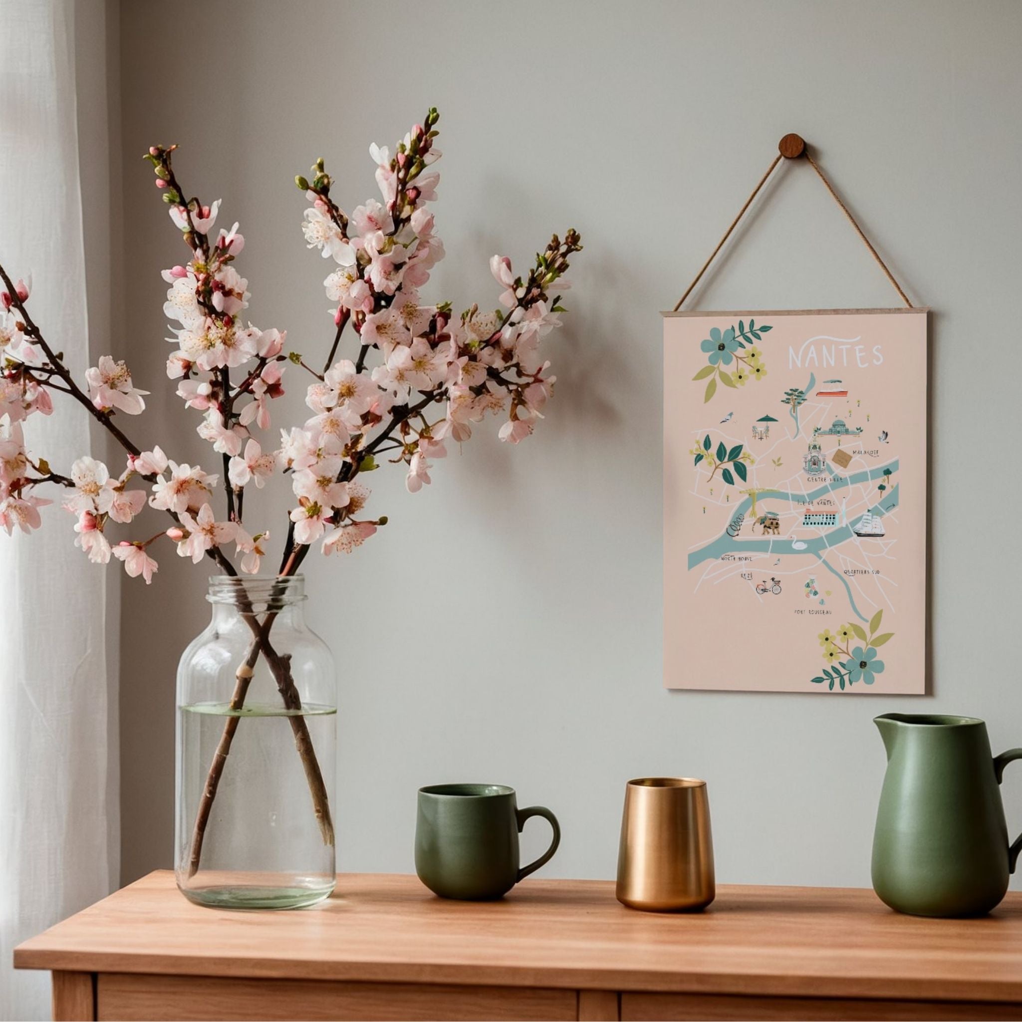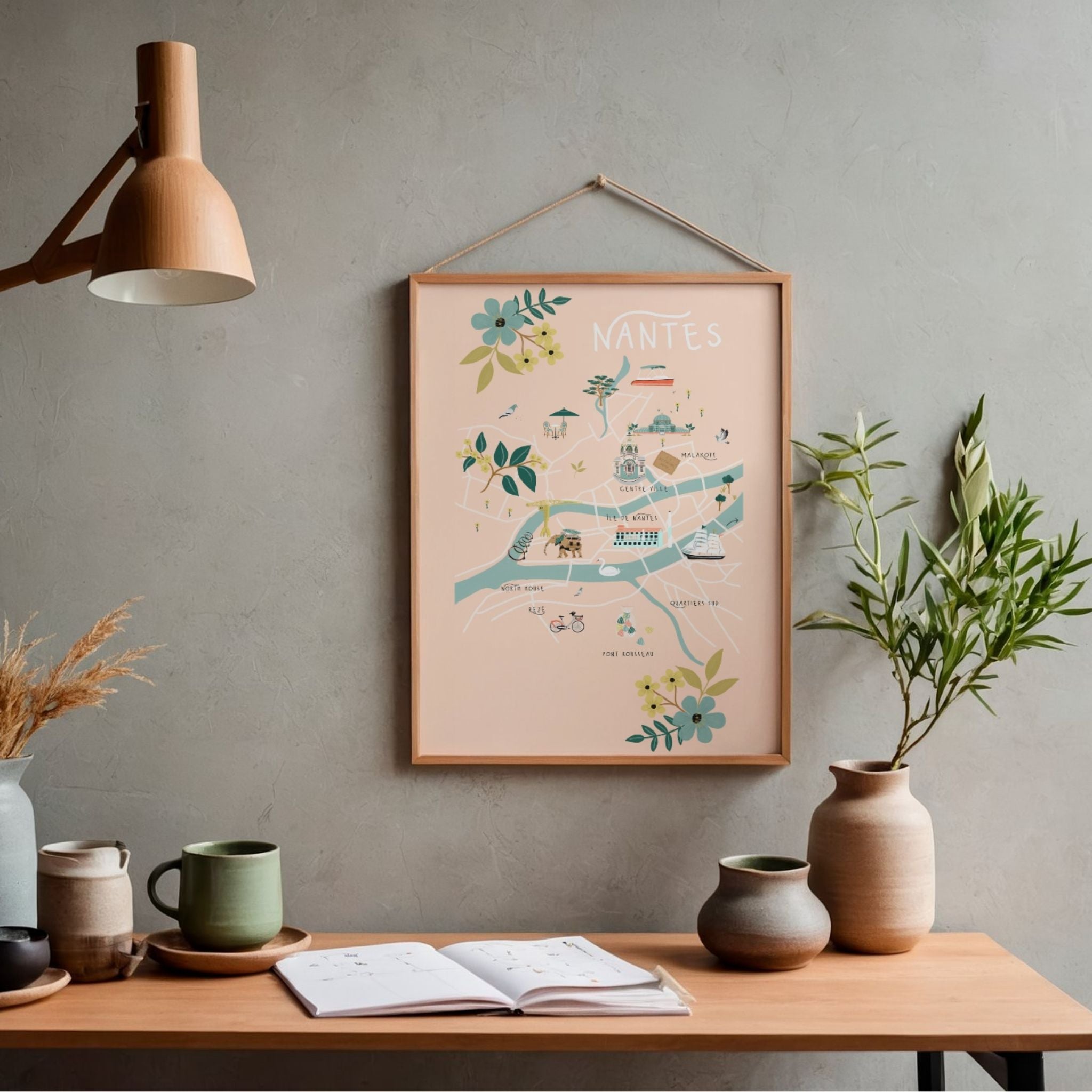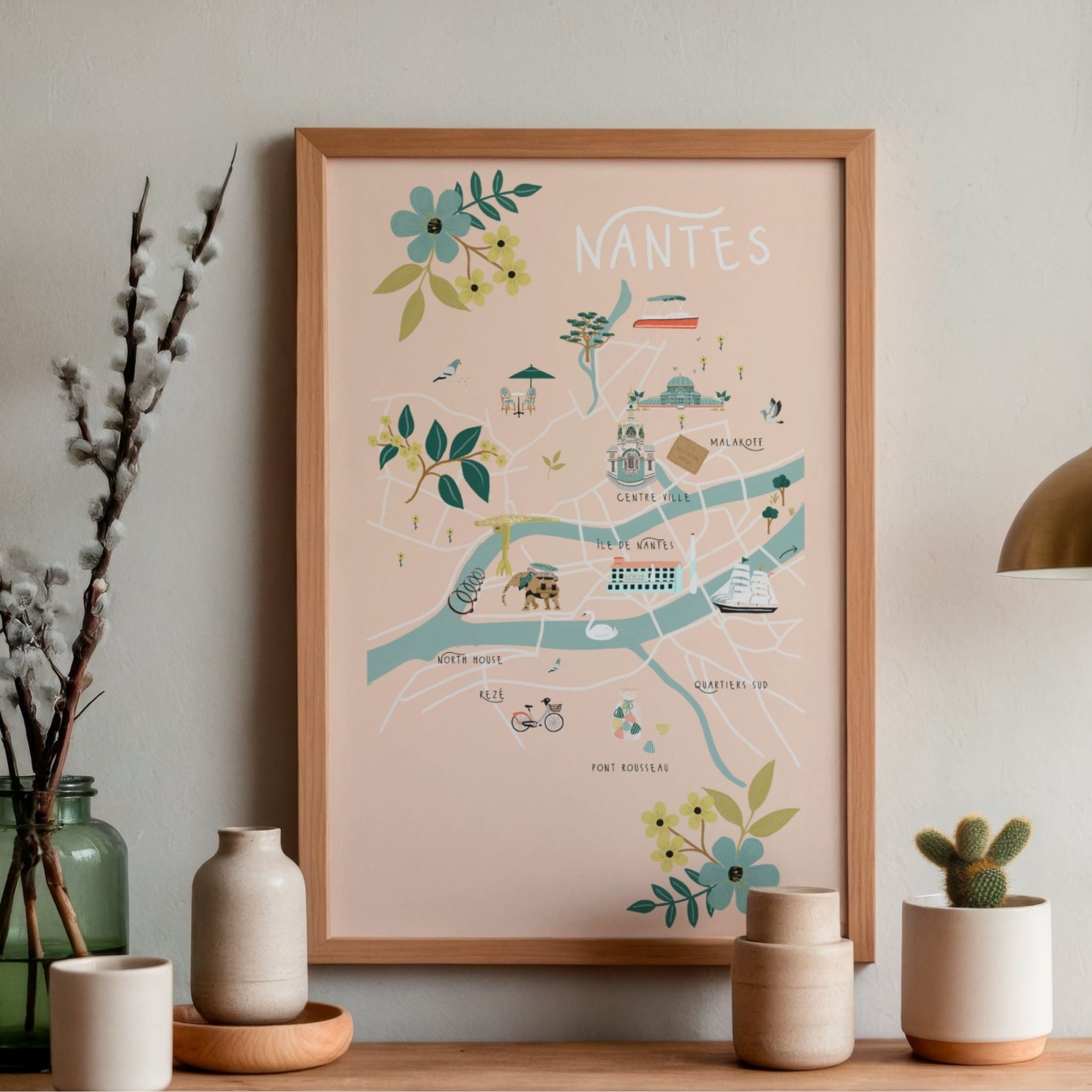 Découvrez une belle affiche de Nantes, dessinée à la main, qui met en valeur le charme et la douceur de la ville.