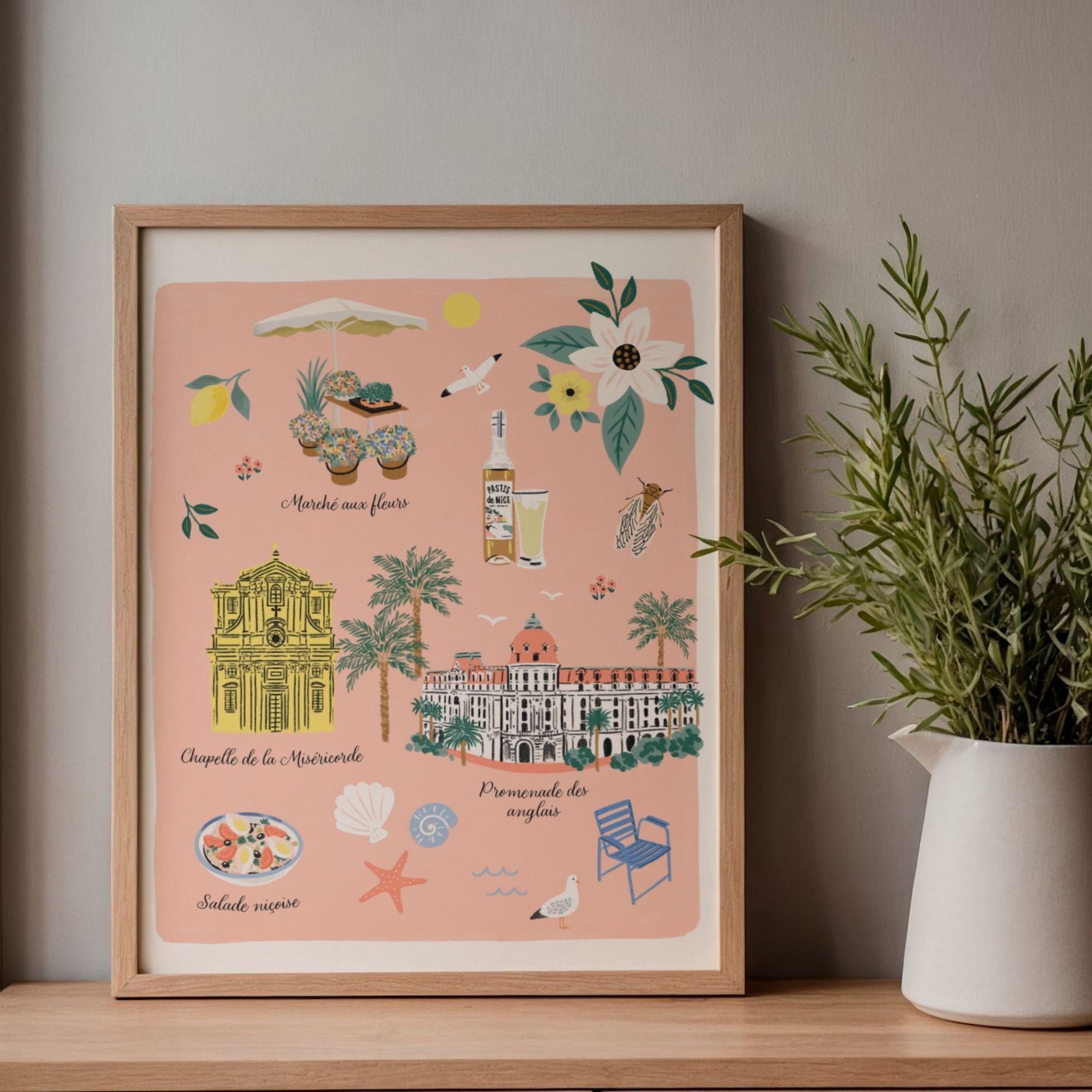 Découvrez une belle affiche de Nice dessinée à la main, qui met en valeur le charme et la douceur de la ville.