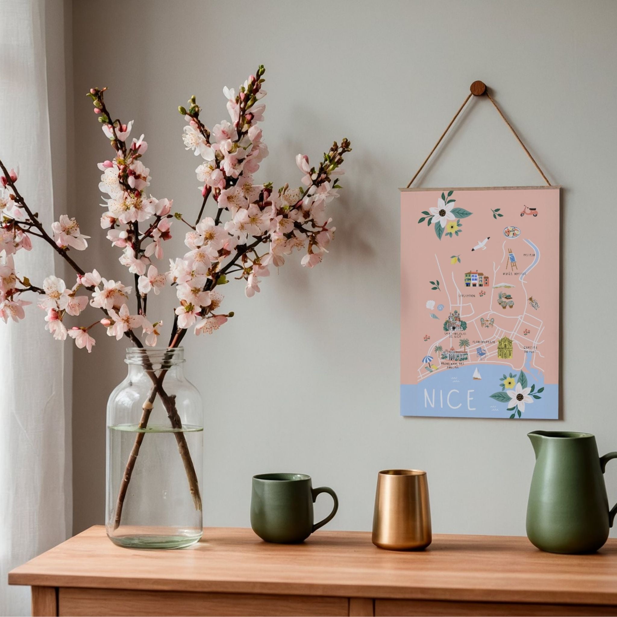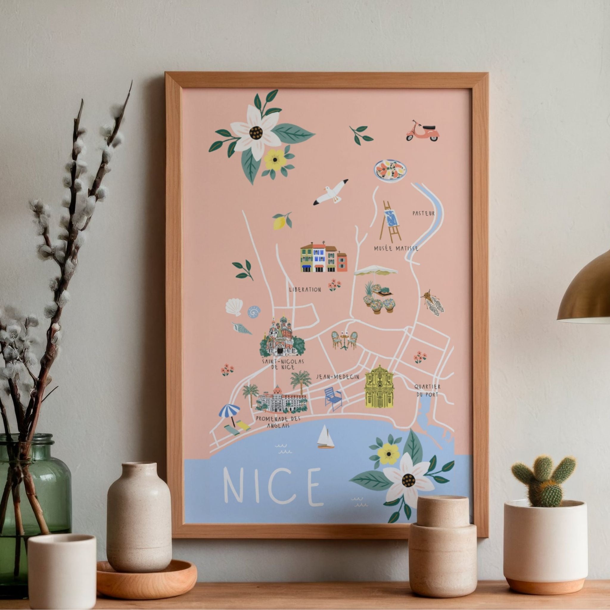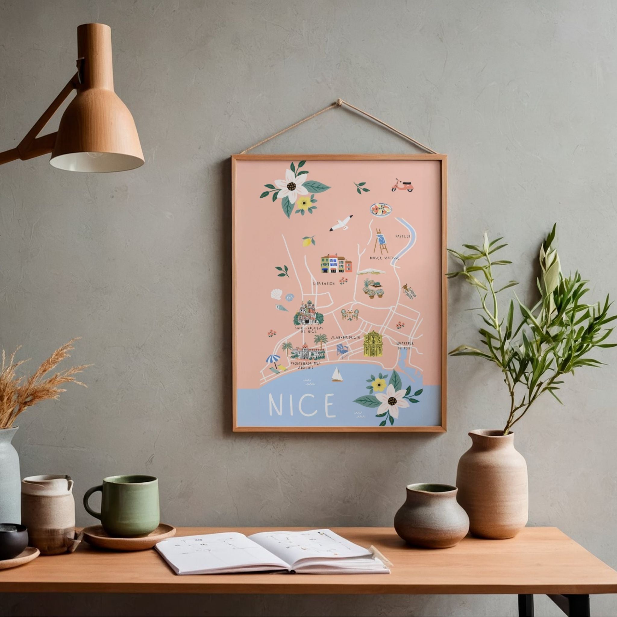 Découvrez une belle affiche de Nice dessinée à la main, qui met en valeur le charme et la douceur de la ville.