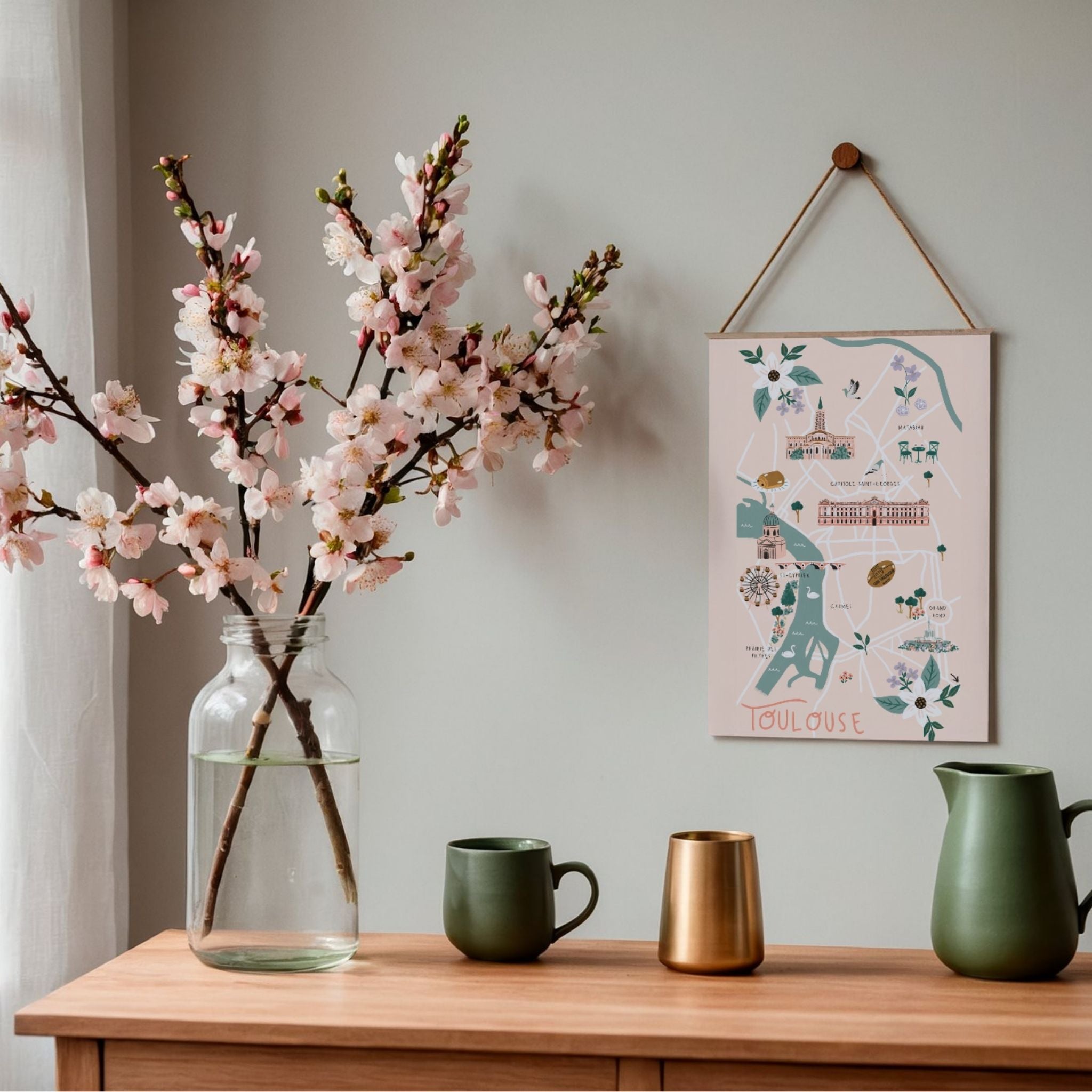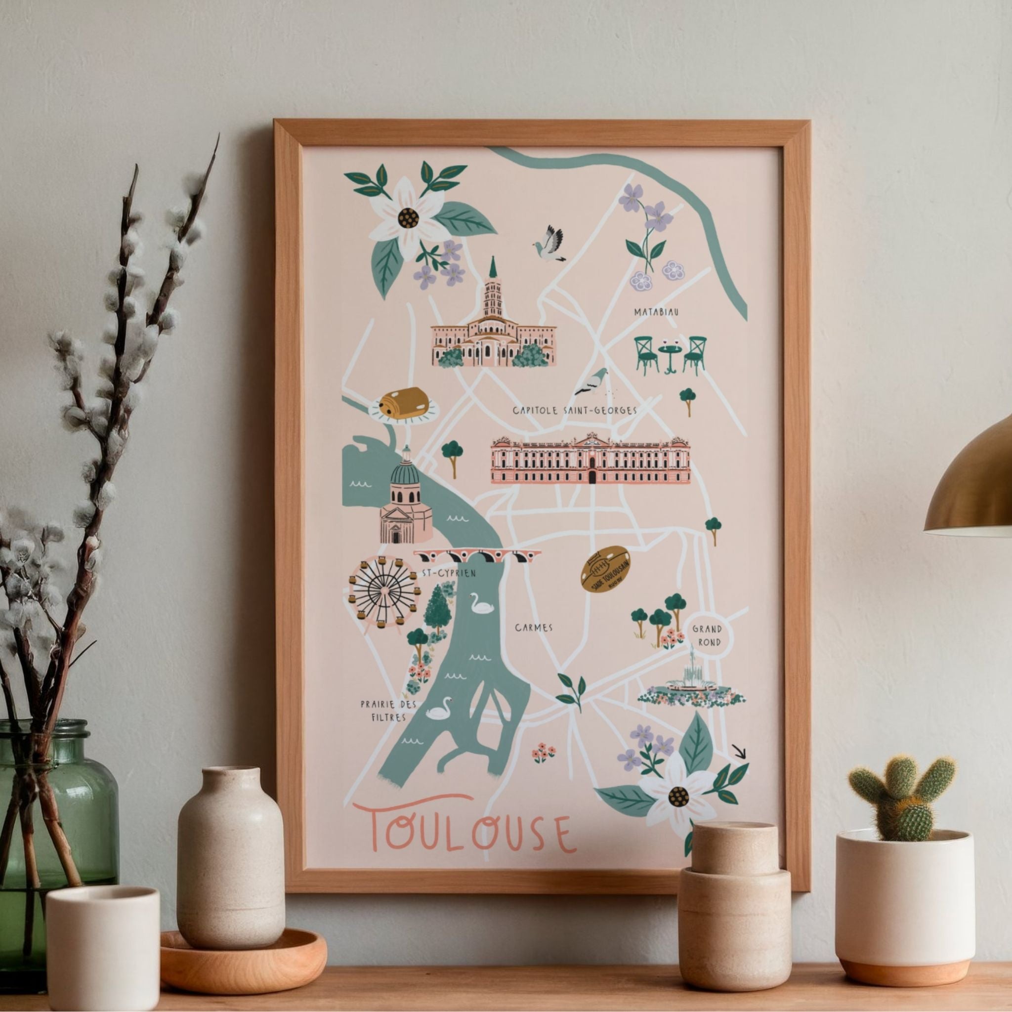 Découvrez une belle affiche de Toulouse dessinée à la main, qui met en valeur le charme et la douceur de la ville.